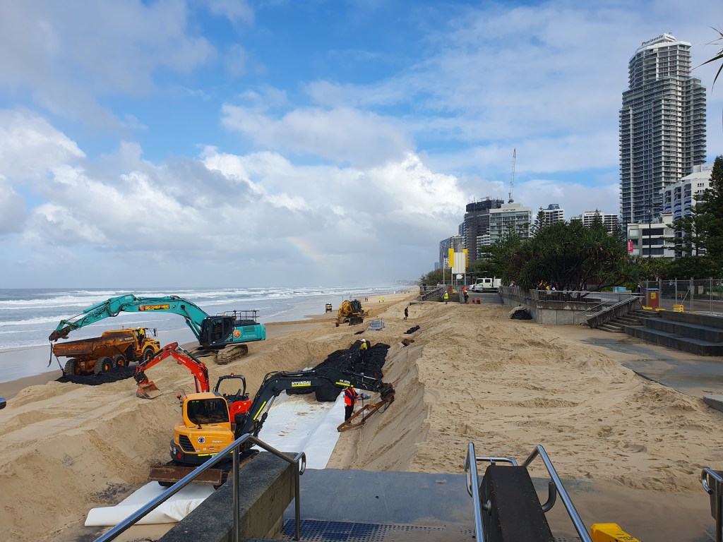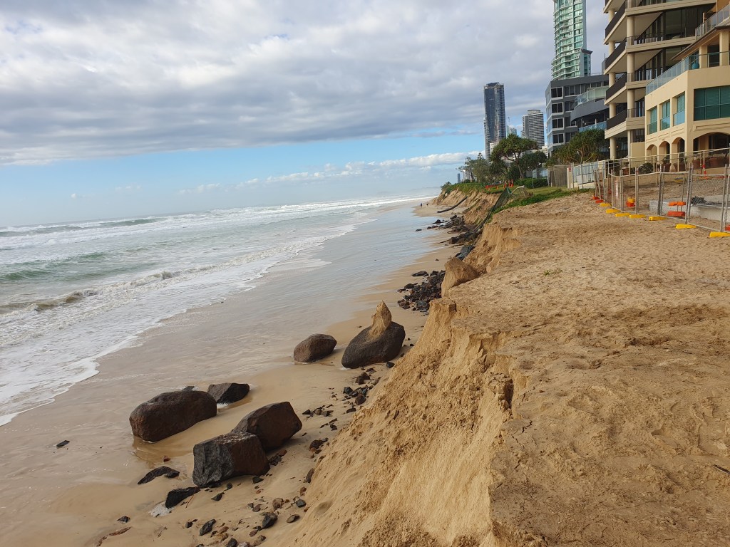 Just three years after those storms, the open beaches from The Spit to Rainbow Bay are again undergoing large scale sand loss in a process that began while TC Alfred was still hundreds of kilometres out to sea.